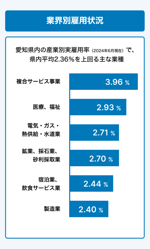 愛知県内の産業別実雇用率(2024年6月現在)で、県内平均2.36%を上回る主な業種は以下の通りです。