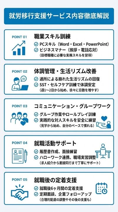 「就職活動のサポート」というよりも、「就職できる状態をつくるための総合的な訓練の場」という理解が正確です。