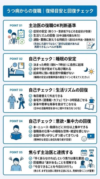 - 復職の目安は、睡眠・生活リズム・意欲の客観的な指標で判断する