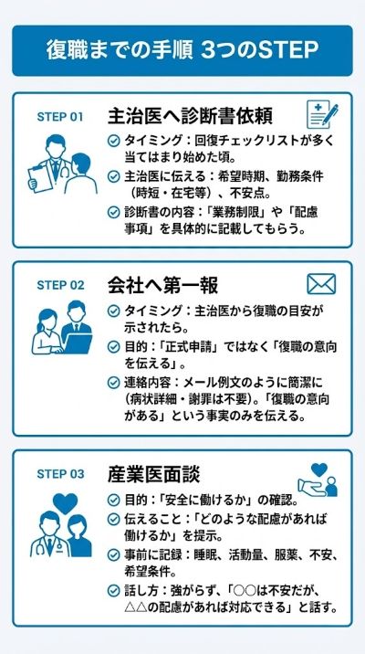 - 手順は「主治医→会社→産業医」の順で、記録を残しながら進める