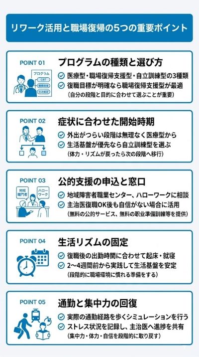 - リワークの活用・自己準備のどちらが合うかを主治医と相談して決める
